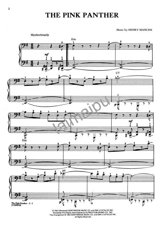 3级、钢琴独奏、这首流畅的爵士乐主题,是流行的电影《克糊涂大侦探》的主题,已简化为中级初段钢琴家欣赏。两手均以低音谱号书写。E小调。