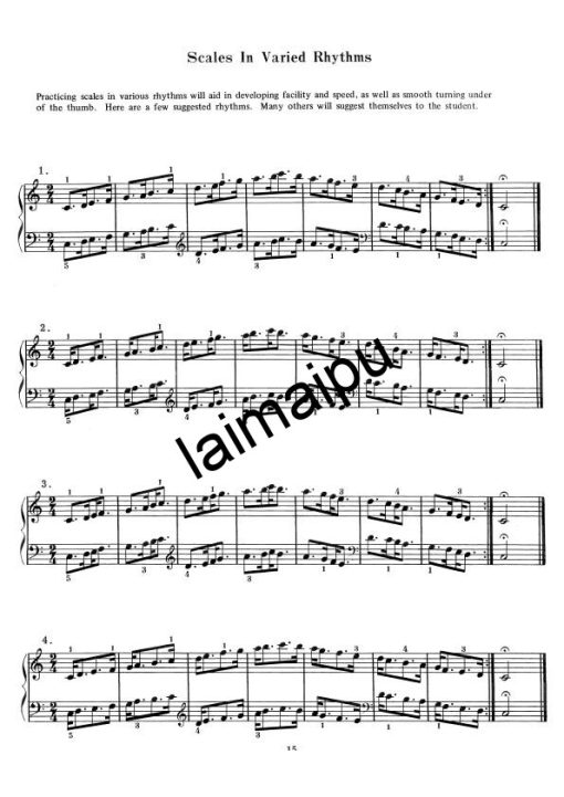 除了讲解大小调的原理与音阶琶音的乐谱,还有节奏变换等练习方式。