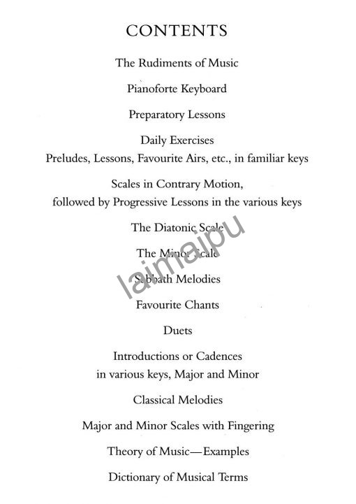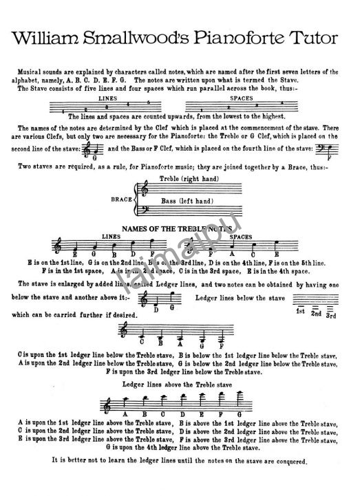 斯莫伍德钢琴教程首先向初学者介绍最基本的乐理知识:音阶、音符名称、谱号、时间等。然后引导演奏者进行基本的日常练习,并最终向演奏者介绍大调和小调音阶,并赠送使用适当音阶进行的短曲。本教程还包括一本非常有用的音乐术语词典。