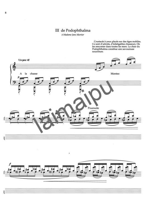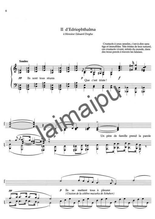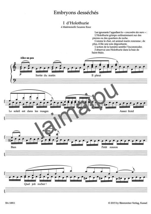 痛恨主流权威的萨替,无孔不入的讥讽学术界。在干涸的胚胎的三首小品中,第一首便以莫札特的阿尔贝提低音起头,经过一连串没头没尾的音符之后,换来了20多个终止式。当大家觉得总该结束了吧的时候,突然又出现了一个大和弦。