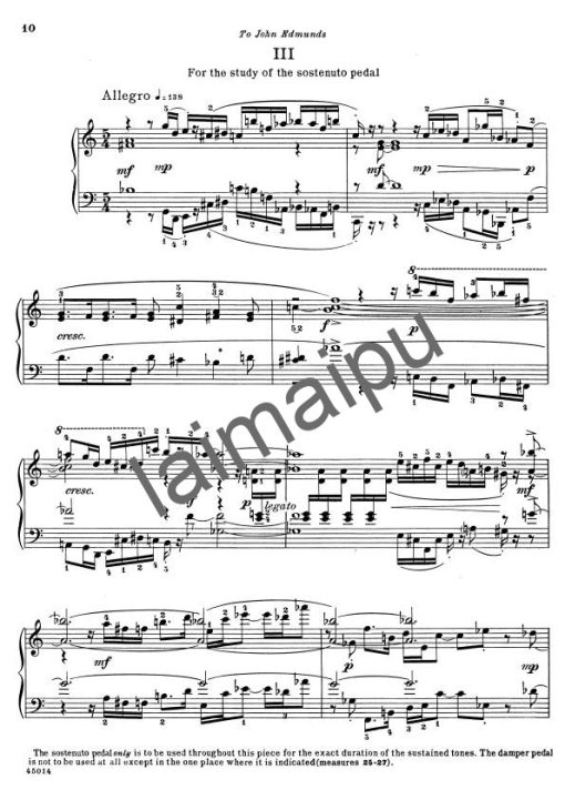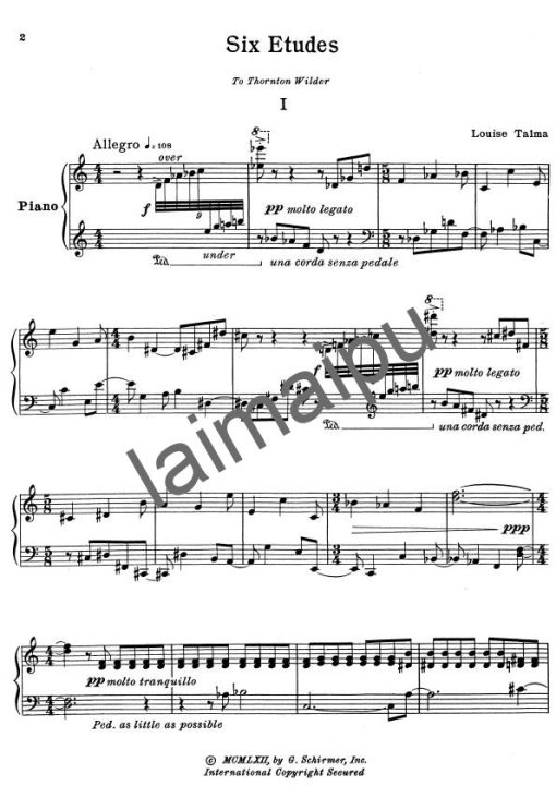 塔耳玛(1906-1996)是美国作曲家、钢琴家,于法国向女作曲家布朗热(Boulanger)学习作曲。她是第一个在欧洲发表全本歌剧的女性作曲家,意义非凡。她的钢琴作品不少,这一套练习曲是在1954年创作,该年她刚开始使用12音列的作曲方式,在这作品可以明显的观察出来。