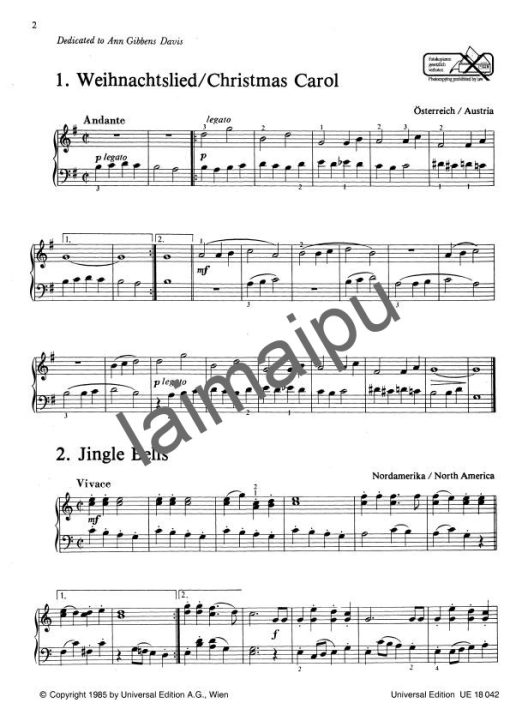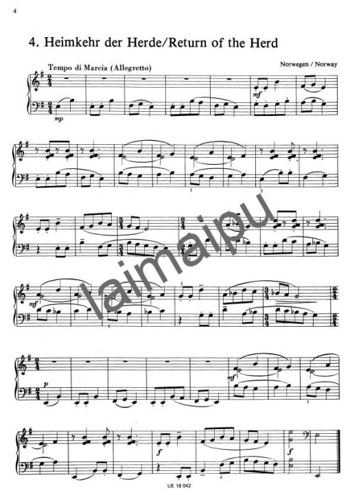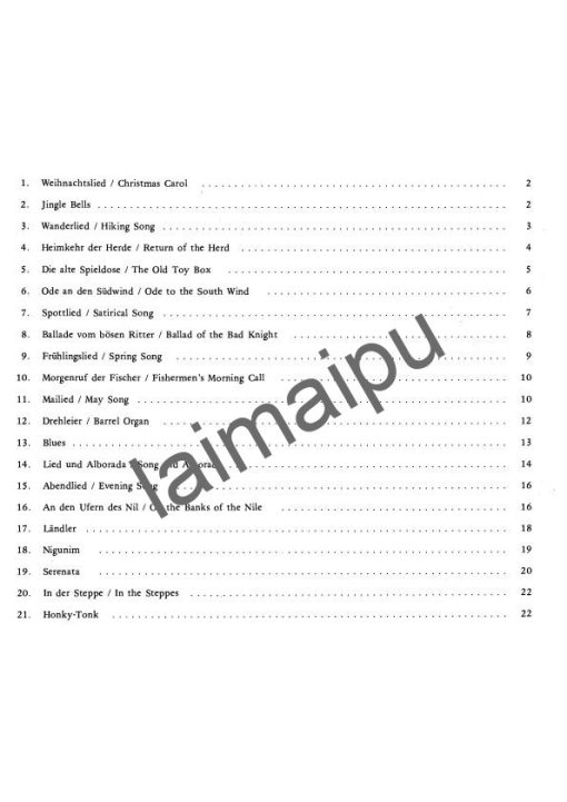 这套由匈牙利作曲家塔卡次(1902-2005)创作的组曲,记录了21首从世界各地收集的民谣/曲调而写成的简单钢琴曲。有奥地利、北美、匈牙利、挪威、德国、日本、冰岛、南斯拉夫、印尼、波西米亚、西班牙、埃及、以色列、意大利、鞑靼等地的短曲,进行一趟乐谱上的旅行。
