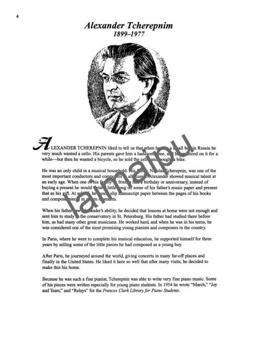 作曲家、作者、编者、译者 | Kraehenbuehl, David | 克劳恩布尔, Alexander Tcherepnin | 齐尔品, Bela Bartok | 巴托克, Dmitri Kabalevsky | 卡巴列夫斯基, Tansman, Alexandre | 汤斯曼 |