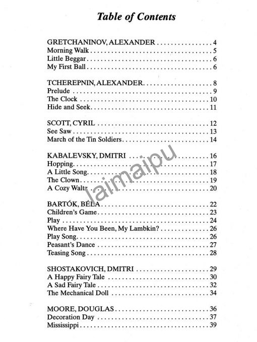 The Contemporary Piano Literature series includes a selection of music written for children by Bartok, Gretchaninov, Kabalevsky, Prokofiev, Scott, Shostakovich and Stravinsky. In addition, the books contain pieces composed specifically for this series by Ross Lee Finney, David Kraehenbuehl, Douglas Moore, Elie Siegmeister, Alexandre Tansman and Alexander Tcherepnin. Short biographies and portraits help make composers come alive for the student. None of the music is so far in the vanguard that it is difficult to enjoy or understand.