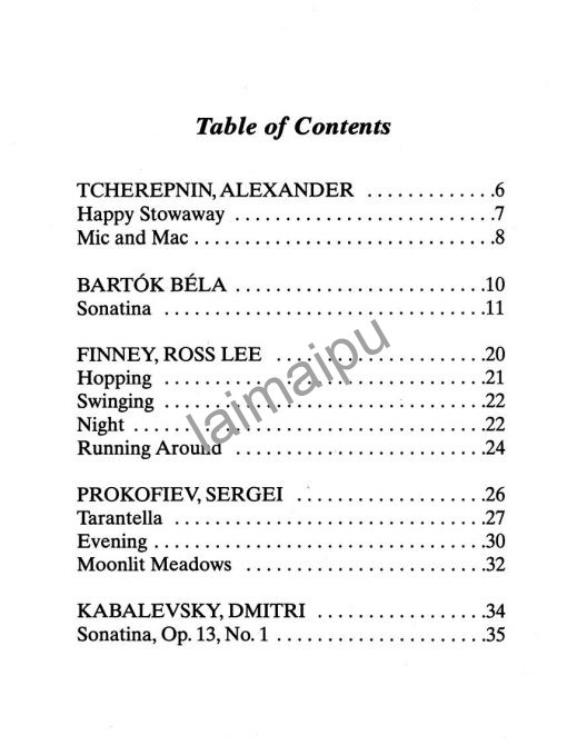 The Contemporary Piano Literature series includes a selection of music written for children by Bartok, Gretchaninov, Kabalevsky, Prokofiev, Scott, Shostakovich and Stravinsky. In addition, the books contain pieces composed specifically for this series by Ross Lee Finney, David Kraehenbuehl, Douglas Moore, Elie Siegmeister, Alexandre Tansman and Alexander Tcherepnin. Short biographies and portraits help make composers come alive for the student. None of the music is so far in the vanguard that it is difficult to enjoy or understand.