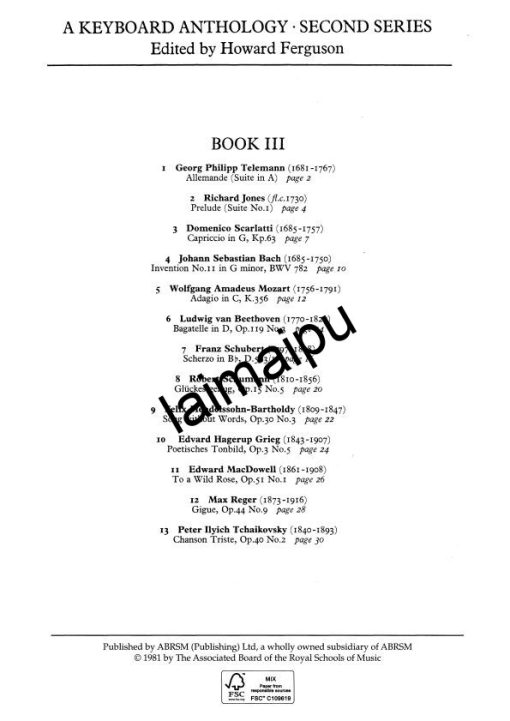 作曲家、作者、编者、译者 | Jones, Richard | 琼斯, Domenico Scarlatti | D. 斯卡拉蒂, Georg Philipp Telemann | 泰雷曼, Grieg, Edvard | 格里格, Ilyich Tchaikovsky | 柴科夫斯基, Johann Sebastian Bach | JS 巴赫, Ludwig van Beethoven | 贝多芬, MacDowell, Edward | 麦克道威尔, Mendelssohn, Felix | 门德尔松, Reger, Max | 雷格, Robert Schumann | Robert 舒曼, Schubert, Franz | 舒伯特 |