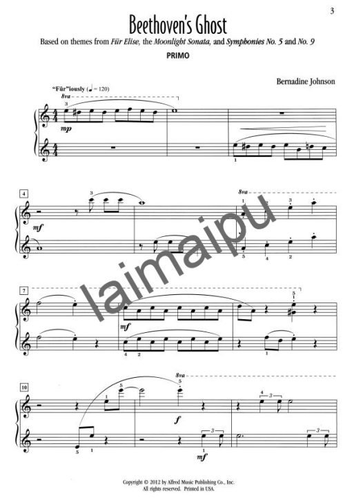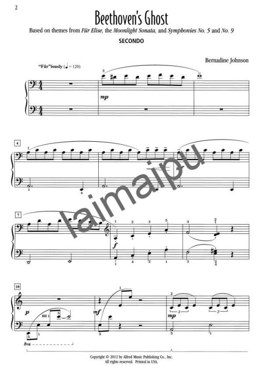 Students will be delighted with this charming duet that features themes from some of Ludwig van Beethoven’s most famous compositions. Part of the fun will be analyzing the music to see where the melodies from Fur Elise, the Moonlight Sonata, and Symphonies No. 5 and 9 are used. Intertwined with these melodies is a theme that evokes suspense, aptly reflecting the title. Written in A minor and 4/4 meter, the suspense is traded back and forth between the primo and secondo parts that are equal in difficulty.