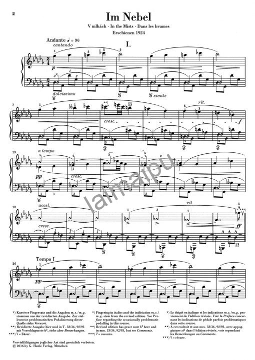 钢琴音乐在杨纳切克的作品中占有很小的位置,但在音乐上却很重要。经验丰富的Janácek编辑Jirí Zahrádka编辑的 “In the Mists “是一个令人印象深刻的例子。这部小周期曲创作于1912年,次年首次出版。但就像通常的情况一样,亚纳切克被要求对其进行修改。1922年12月,钢琴家斯捷潘-瓦茨拉夫(Stepán Václav)在布拉格首次演出后,作曲家和翻译家共同对该作品进行了修订,并于1924年出版。我们现在以Henle Urtext版的形式出版这个最终版本,该版本还为实际问题提供了令人信服的解决方案,例如如何处理瓦茨拉夫和雅纳塞克不一致的踏板标记。