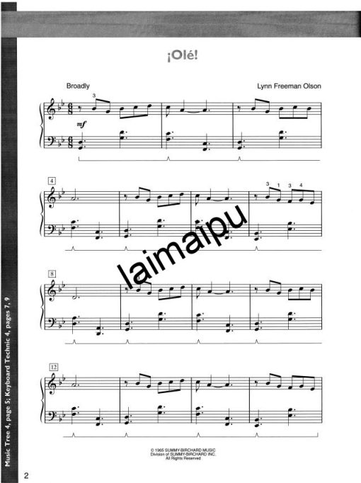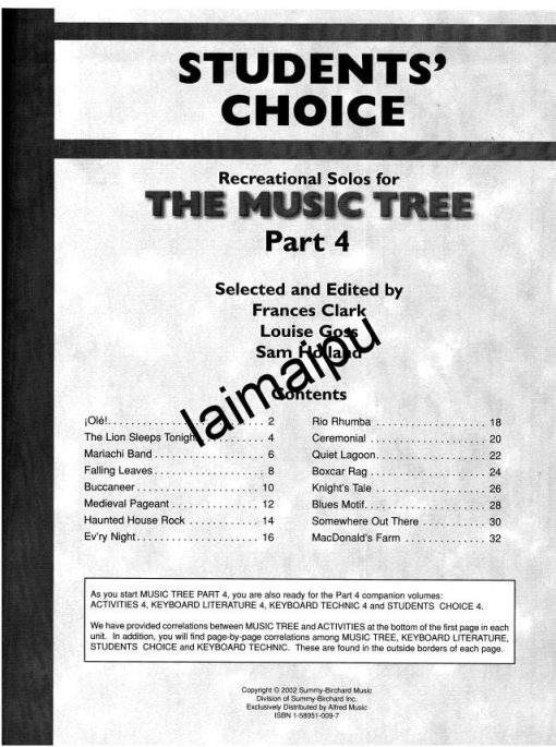 音乐树系列继续发展完整的音乐能力,为初学者提供令人愉快和多样化的曲目。学生将学习到包括民谣、爵士乐和流行音乐在内的各种曲风。学生的创造力得到了强调,因为他们得到了重新编排、转调、完整的音乐片段,或作为新的创作的基础。技术方面的问题也得到了解决,包括更多的内容像音程与和弦,以及更多的手一起演奏。指导性的训练步骤被用来鼓励智能的练习技巧。